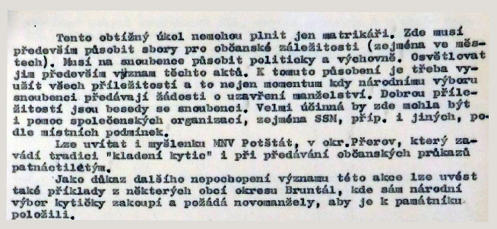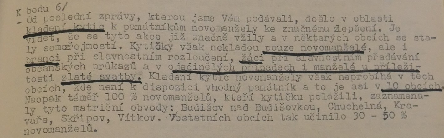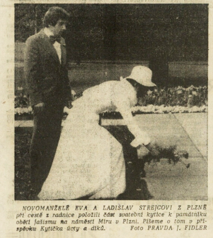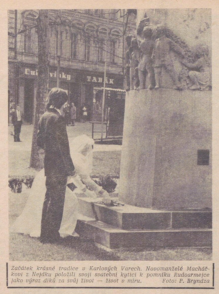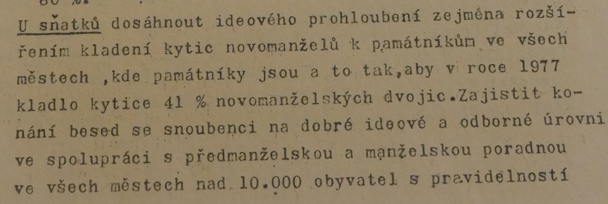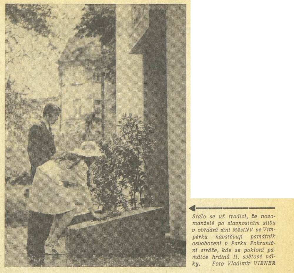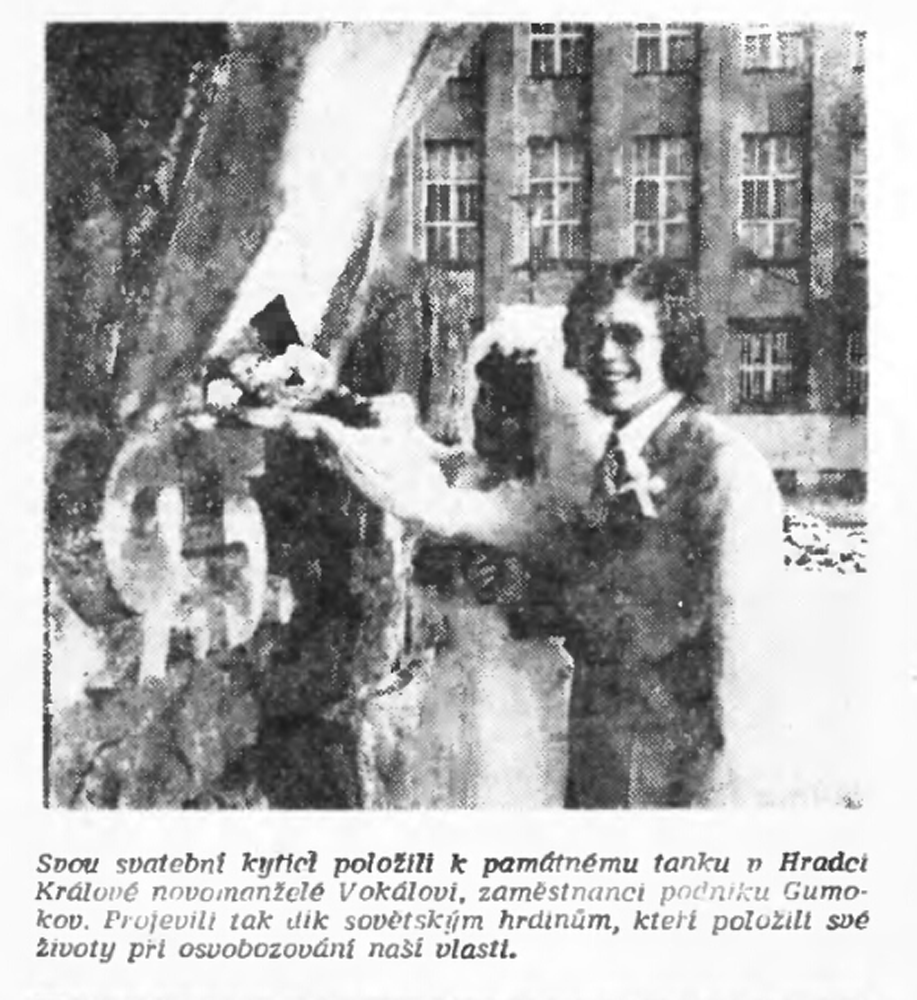 Jednou z iniciativ, které měly posilovat propojení oficiální paměti druhé světové války, úcty k hrdinům protifašistického a komunistického boje a lásku k SSSR s osobní angažovaností, byla inovace svatebního obřadu propagovaná od první poloviny sedmdesátých let. Sbory pro občanské záležitosti, které vznikaly od konce padesátých let při národních výborech, měly v první řadě za úkol vytlačovat ze života lidí vliv církve a neformálních spolků. Obřadům, spojovaným s významnými životními etapami jako byly křtiny, biřmování, svatby či pohřby, pomáhaly dávat občanskou, „socialistickou“ formu. Za tím účelem přebíraly a transformovaly již existující tradice a záměrně vytvářely tradice nové. Po krátkém rozvolnění na konci šedesátých let se s normalizací opět projevila snaha učinit z civilních obřadů prostředek politické výchovy a manifestační akt sounáležitosti se socialistickými idejemi. V tomto kontextu se zrodil záměr vyšších organizačních složek Sborů pro občanské záležitosti zavést a při příležitosti 30. výročí osvobození plošně rozšířit tradici kladení kytic novomanželi k památníkům druhé světové války. Toto gesto, bezesporu inspirované sovětskou praxí, mělo vyjadřovat úctu povětšinou mladých lidí k obětem a hrdinům války a zároveň povzbudit jejich internacionální cítění, především k Sovětskému svazu. Přes veškeré snahy tradici popularizovat a úředními manévry podpořit, případně rozšířit na jiné životní situace či na pomníky revolučního hnutí. není z dostupných materiálů zřejmé, zda se ji podařilo udržet dlouhodobě až do konce komunistického režimu. Problémy vznikaly nejenom kvůli (ne)dostupnosti vhodných pomníků, byť právě podobné rituály po nich vytvářely poptávku a mohly se stát další motivací pro jejich výstavbu. Rozpory se objevovaly také okolo květin, které se měly k pomníkům klást. Sami iniciátoři uznávali, že těžko lze po nevěstách chtít, aby se vzdaly své svatební kytice, zároveň však odsuzovali praxi, kdy se pro tento účel poskytovaly novomanželům květiny pořízené z prostředků národních výborů. Některé okresy, například Vsetín, vykazovaly vůči zavádění tohoto zvyku vysokou míru rezistence.