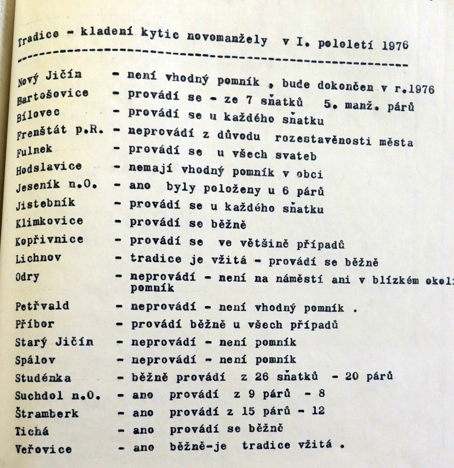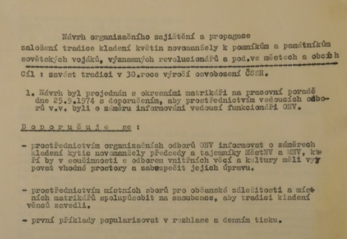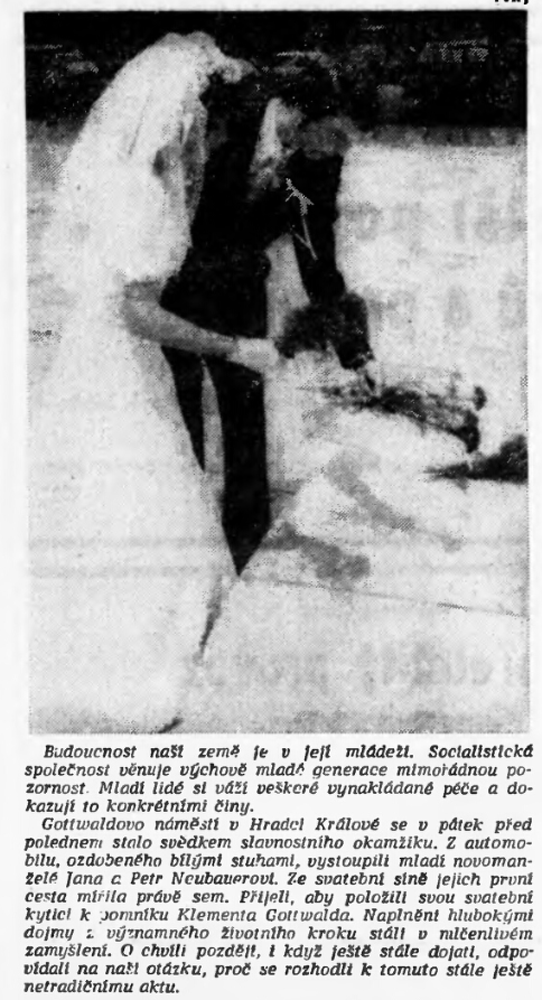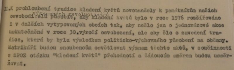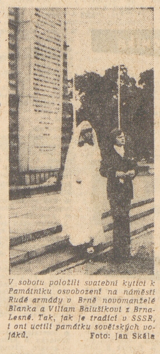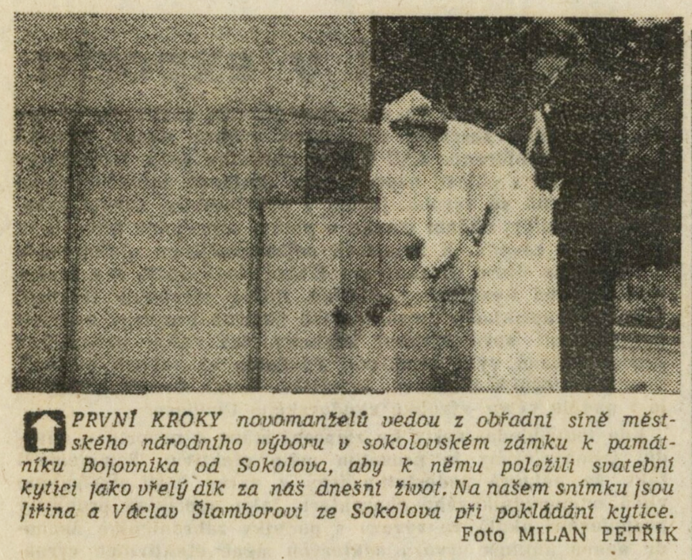 Jednou z iniciativ, které měly posilovat propojení oficiální paměti druhé světové války, úcty k hrdinům protifašistického a komunistického boje a lásku k SSSR s osobní angažovaností, byla inovace svatebního obřadu propagovaná od první poloviny sedmdesátých let. Sbory pro občanské záležitosti, které vznikaly od konce padesátých let při národních výborech, měly v první řadě za úkol vytlačovat ze života lidí vliv církve a neformálních spolků. Obřadům, spojovaným s významnými životními etapami jako byly křtiny, biřmování, svatby či pohřby, pomáhaly dávat občanskou, „socialistickou“ formu. Za tím účelem přebíraly a transformovaly již existující tradice a záměrně vytvářely tradice nové. Po krátkém rozvolnění na konci šedesátých let se s normalizací opět projevila snaha učinit z civilních obřadů prostředek politické výchovy a manifestační akt sounáležitosti se socialistickými idejemi. V tomto kontextu se zrodil záměr vyšších organizačních složek Sborů pro občanské záležitosti zavést a při příležitosti 30. výročí osvobození plošně rozšířit tradici kladení kytic novomanželi k památníkům druhé světové války. Toto gesto, bezesporu inspirované sovětskou praxí, mělo vyjadřovat úctu povětšinou mladých lidí k obětem a hrdinům války a zároveň povzbudit jejich internacionální cítění, především k Sovětskému svazu. Přes veškeré snahy tradici popularizovat a úředními manévry podpořit, případně rozšířit na jiné životní situace či na pomníky revolučního hnutí. není z dostupných materiálů zřejmé, zda se ji podařilo udržet dlouhodobě až do konce komunistického režimu. Problémy vznikaly nejenom kvůli (ne)dostupnosti vhodných pomníků, byť právě podobné rituály po nich vytvářely poptávku a mohly se stát další motivací pro jejich výstavbu. Rozpory se objevovaly také okolo květin, které se měly k pomníkům klást. Sami iniciátoři uznávali, že těžko lze po nevěstách chtít, aby se vzdaly své svatební kytice, zároveň však odsuzovali praxi, kdy se pro tento účel poskytovaly novomanželům květiny pořízené z prostředků národních výborů. Některé okresy, například Vsetín, vykazovaly vůči zavádění tohoto zvyku vysokou míru rezistence.