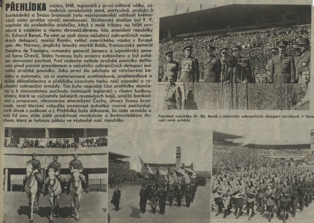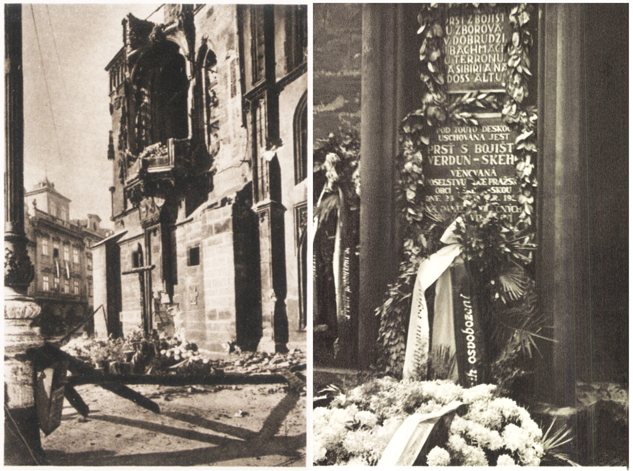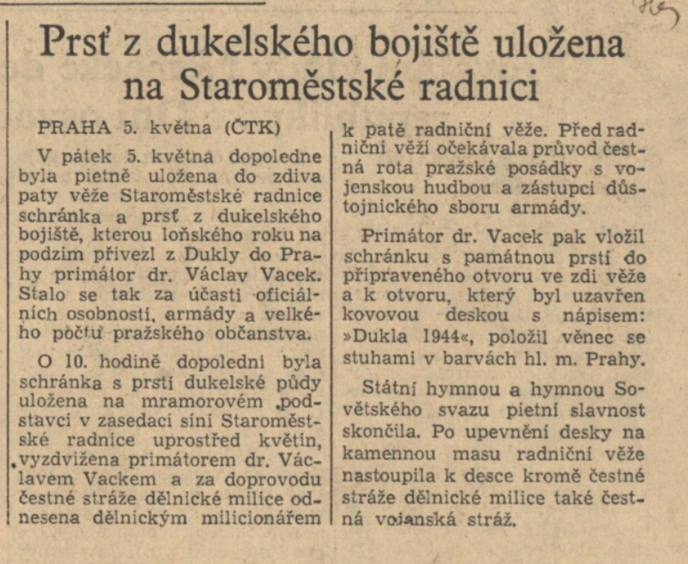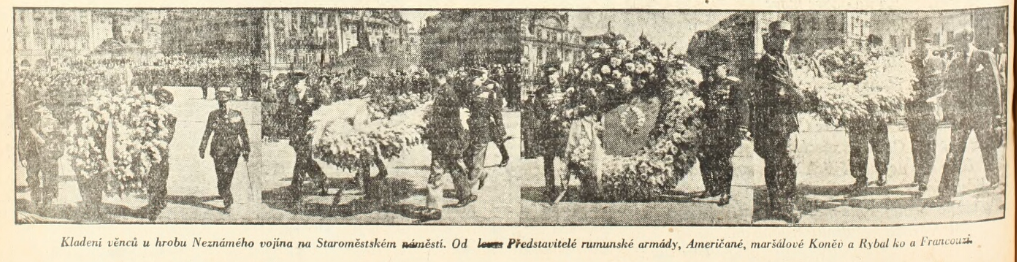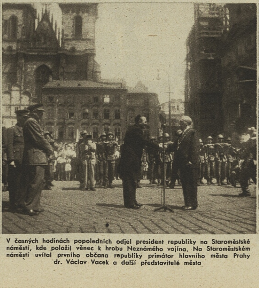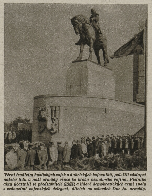 Vyjádření úcty a piety padlým bezprostředně po skončení bojů mohlo navazovat – a také navazovalo – na tradici vzešlou z první světové války, kdy se padlým vzdávala úcta skrze symbolického Neznámého vojína. Hroby a pomníky či památníky s ostatky neidentifikovaného vojáka z bojišť Velké války byly vybudovány v mnoha zemích a staly se významnými národními památkami. Jistě pečlivě připravované aranžmá příjezdu prezidenta Beneše do osvobozené Prahy tuto tradici následovalo – Edvard Beneš s doprovodem přijel z nádraží na Staroměstské náměstí a součástí oficiálního uvítání byla i pieta před bombardovanou a vyhořelou radnicí, kde byl ve dvacátých letech vybudován hrob Neznámého vojína, za okupace zničený německou správou. Hned v počátku se tak u Staroměstské radnice propojilo mnoho symbolik – hrob Neznámého vojína jako symbol boje za československou státnost, jeho uctívání občany jako výraz tiché rezistence a násilná likvidace jako způsob národního ponížení za okupace, radnice jako formující se místo paměti těžkých bojů s okupanty a piety za padlé v květnovém povstání, stejně jako začátek připomínání zásluh prvního a druhého odboje společně. I cesta Klementa Gottwalda v den prezidentské inaugurace vedla ještě z Hradu na Staroměstské náměstí k prozatímnímu hrobu Neznámého vojína. Nový režim se ale s odmítanou legionářskou tradicí začal záhy vypořádávat, a to stvořením nové tradice odkazující na boje o Duklu. Podobně jako v roce 1922 u příležitosti 5. výročí bitvy u Zborova byly Prahou v říjnu 1949 v rámci připomínání 5. výročí bojů o Duklu ceremoniálně vezeny ostatky Neznámého vojína (bojovníka) z dukelského bojiště a uloženy za účasti prezidenta do Památníku osvobození na Vítkově (Žižkově), jenž byl původně budován také pro účely legionářské komemorace. V květnu 1950 pak symbolika Dukly převrstvila na desetiletí místo původního hrobu Neznámého vojína z první světové války na Staroměstské radnici.