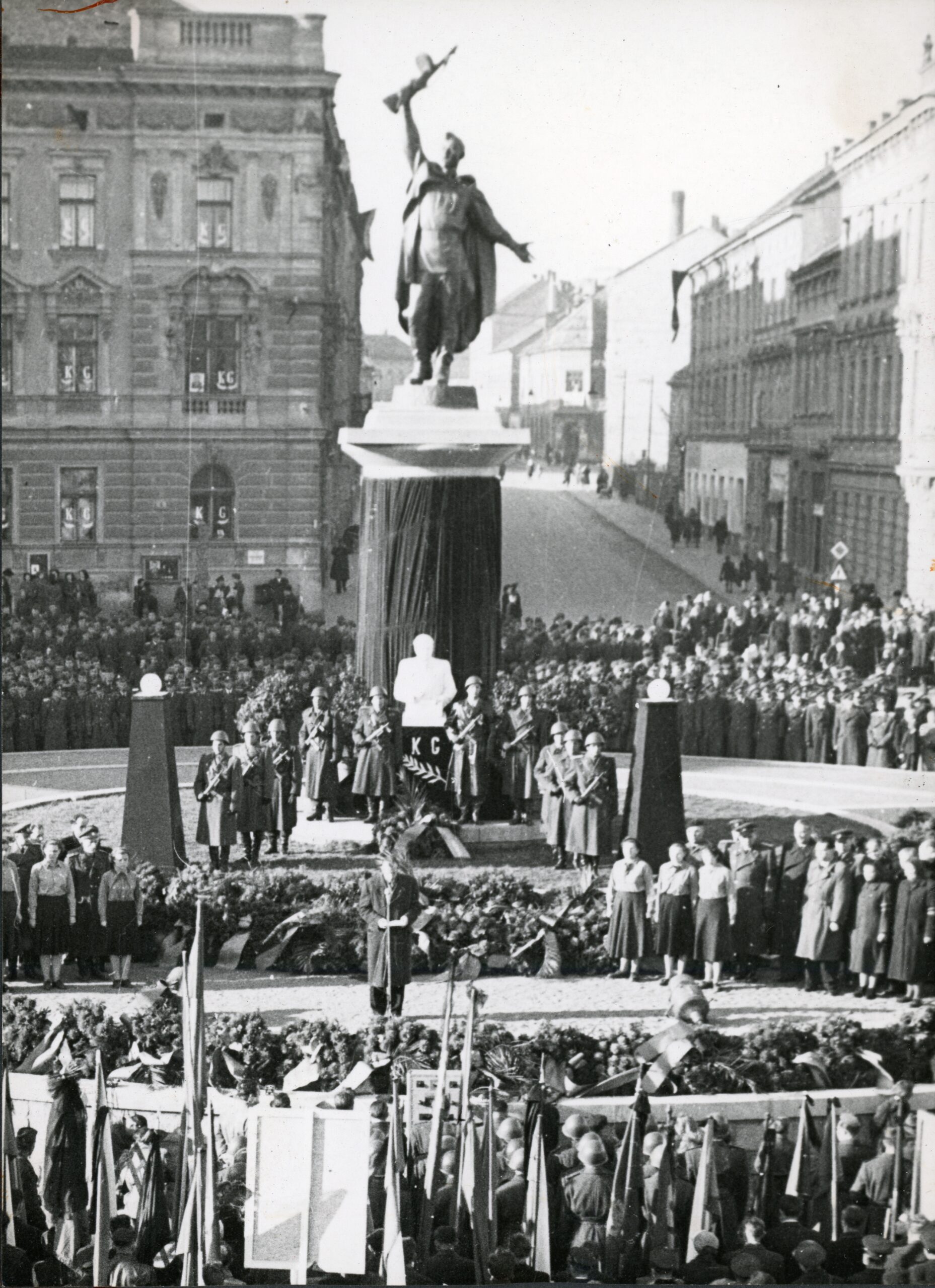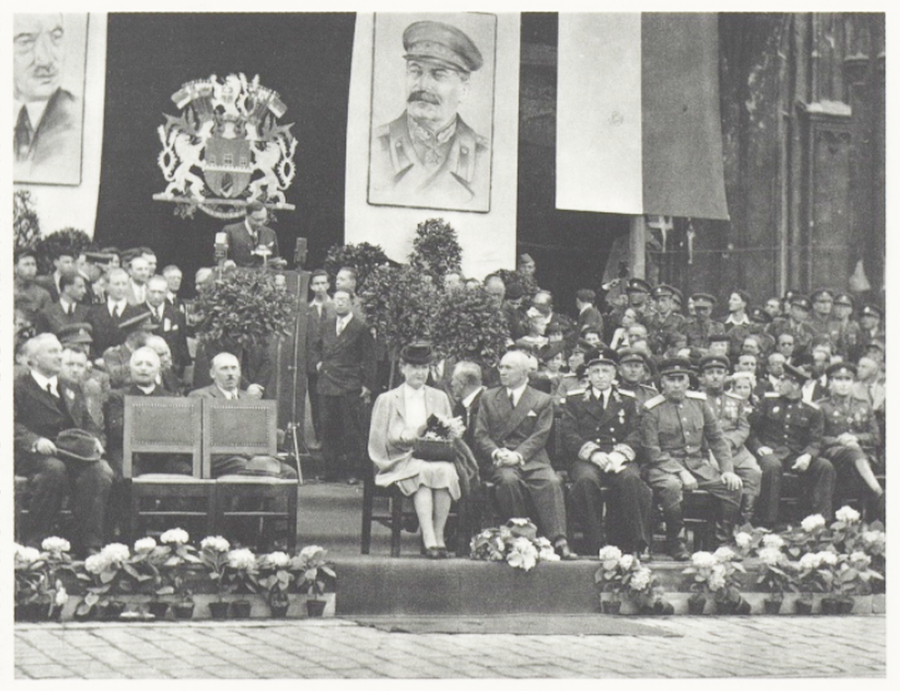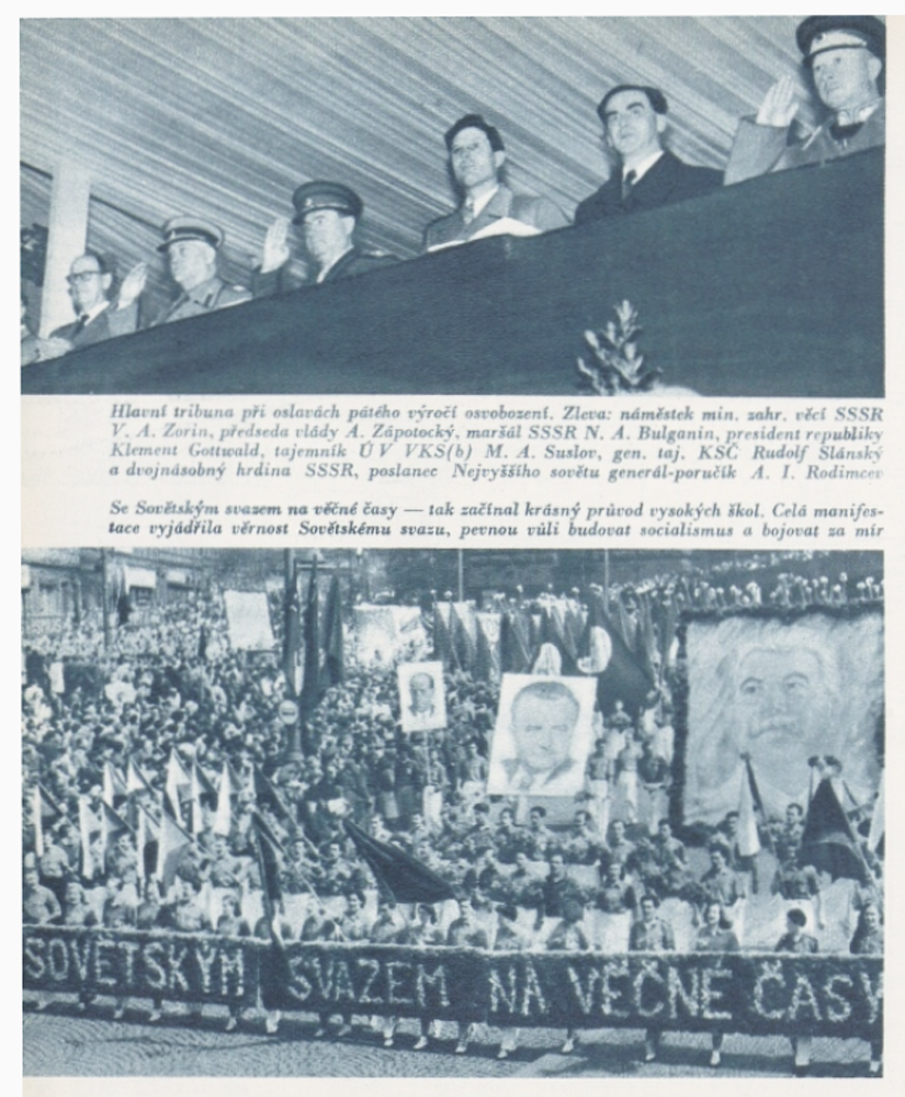 Komunistický režim na dřívější tradice navázal po svém. Oslavy osvobození především zahrnul do své politiky paměti, v níž hlavní místo patřilo komunistickému odboji a Sovětskému svazu. Jednotné vyznění výročních komemorací se stalo předmětem pečlivých a centrálně řízených příprav, které zahrnovaly plánování projevů, hesel, transparentů i zavádění stále komplikovanějších struktur na schvalování pomníků. Z ceremonií zmizeli hosté z kapitalistických zemí, legionáři, účastníci západního vojenského odboje, naopak se v nich objevili milicionáři, skauty nahradili pionýři a svazáci, oficiální rituály se postupně oddělily od církevních obřadů, z veřejného prostoru byly odstraněny některé pomníky a jiné nestačily vzniknout. Osvobození se prolnulo s bolševickou revolucí a tyto dva historické milníky byly společně povýšeny na základy komunistické státnosti. Vizuální zaměnitelnost rituálů provázejících obě významná výročí, v nichž právě pomníky hrály důležitou roli, jejich vzájemné symbolické propojení prakticky posilovala.