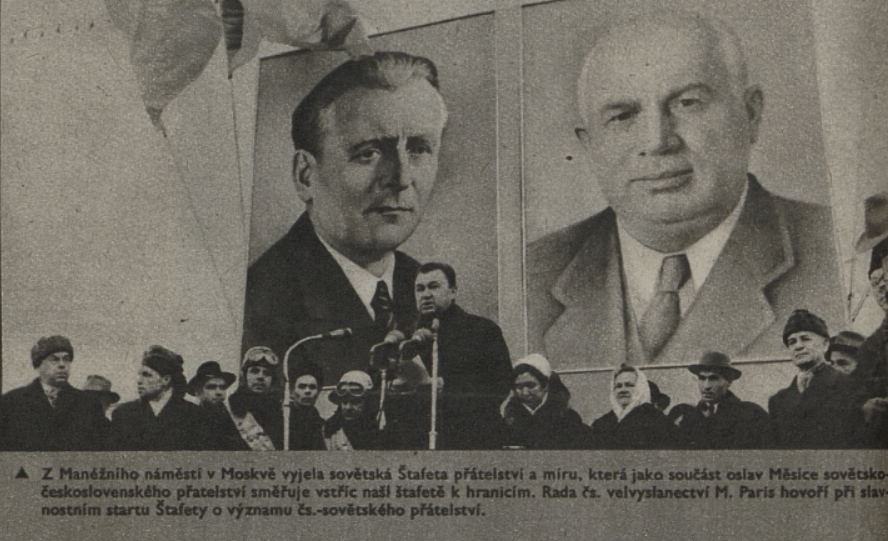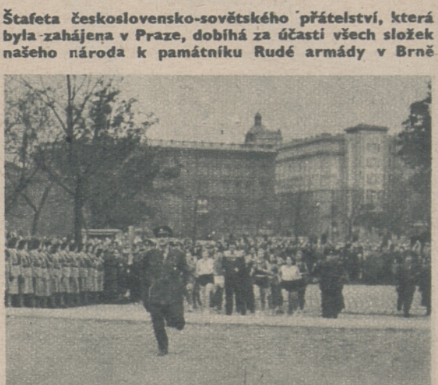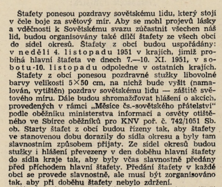 Štafeta přátelství a míru navázala na štafetové běhy v roce 1947, které se konaly při příležitosti druhého výročí konce války, výročí vzniku československé republiky a sokolských předsletových slavností. Květnová štafeta mládeže v roce 1947 měla být kromě uctění památky obětí války projevem česko-slovenského bratrství a trasy z různých koutů republiky včetně Slovenska se sbíhaly na Staroměstském náměstí v Praze u hrobu Neznámého vojína. Od roku 1948 převzal režii štafetového běhu Svaz československo-sovětského přátelství a ze sportovně-kolektivní manifestace poválečné státnosti se stala celostátně orchestrovaná manifestace lásky k Sovětskému svazu, mísící vděčnost za osvobození s aktuálními politickými tématy. Za tím účelem byla celá akce přesunuta na podzim. Nejdříve pod heslem „Bez 7. listopadu by nebylo 28. října“ svým načasováním (28. 10. – 7. 11.) symbolicky propojovala základy samostatné československé státnosti s bolševickou revolucí (Velkou říjnou socialistickou revolucí, VŘSR). Od roku 1951 už byla štafeta pojímána čistě jako součást oslav Měsíce československo-sovětského přátelství, slaveného od 7. listopadu do 12. prosince, dne podepsání československo-sovětské smlouvy v roce 1943. Hlavní trasy orientované z Prahy na československo-sovětské hranice zahrnovaly významná místa národní paměti spjatá s druhou světovou válkou a osvobozeneckým bojem. Do slavnostních ceremonií provázejících předávání štafety a poselství ve větších městech byly vřazovány i postupně budované pomníky. V průběhu času se podoba Štafety přátelství a míru obměňovala. Koncem šedesátých let se opět přesunula do oslav osvobození, později se z ní stala spíše lokální záležitost organizovaná v rámci okresů. Jako oficiální výroční tradice se nicméně v různých variantách udržovala až do konce komunistického režimu. Mezitím ovšem vznikla celá řada nových sportovně-manifestačních rituálů.