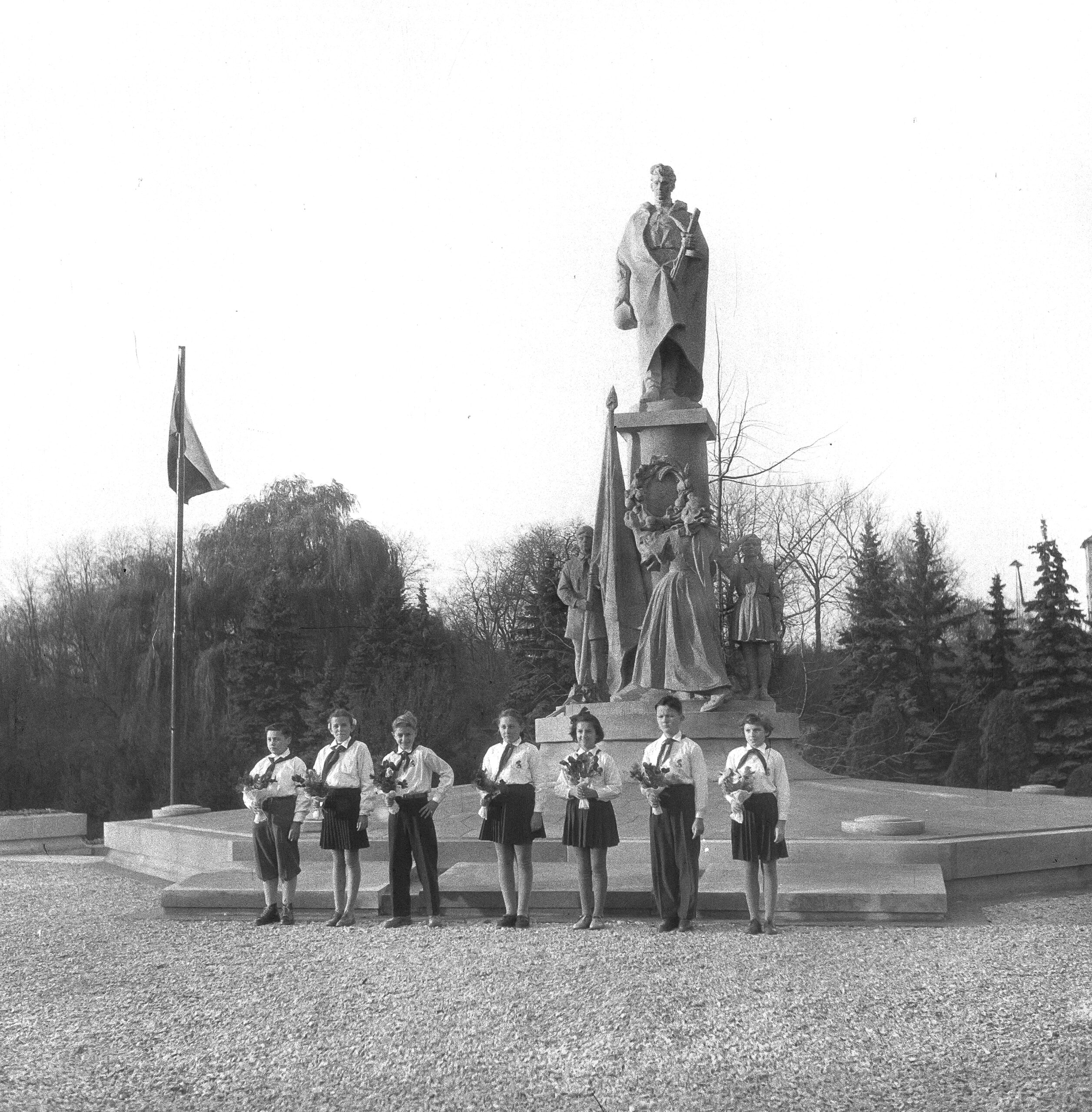Pražské děti u hrobů sovětských vojáků na Olšanských hřbitovech během pietního aktu organizovaného ženským odborem Svazu přátel SSSR, 4. listopadu 1946 /foto z Pět let nového Československa, 1950