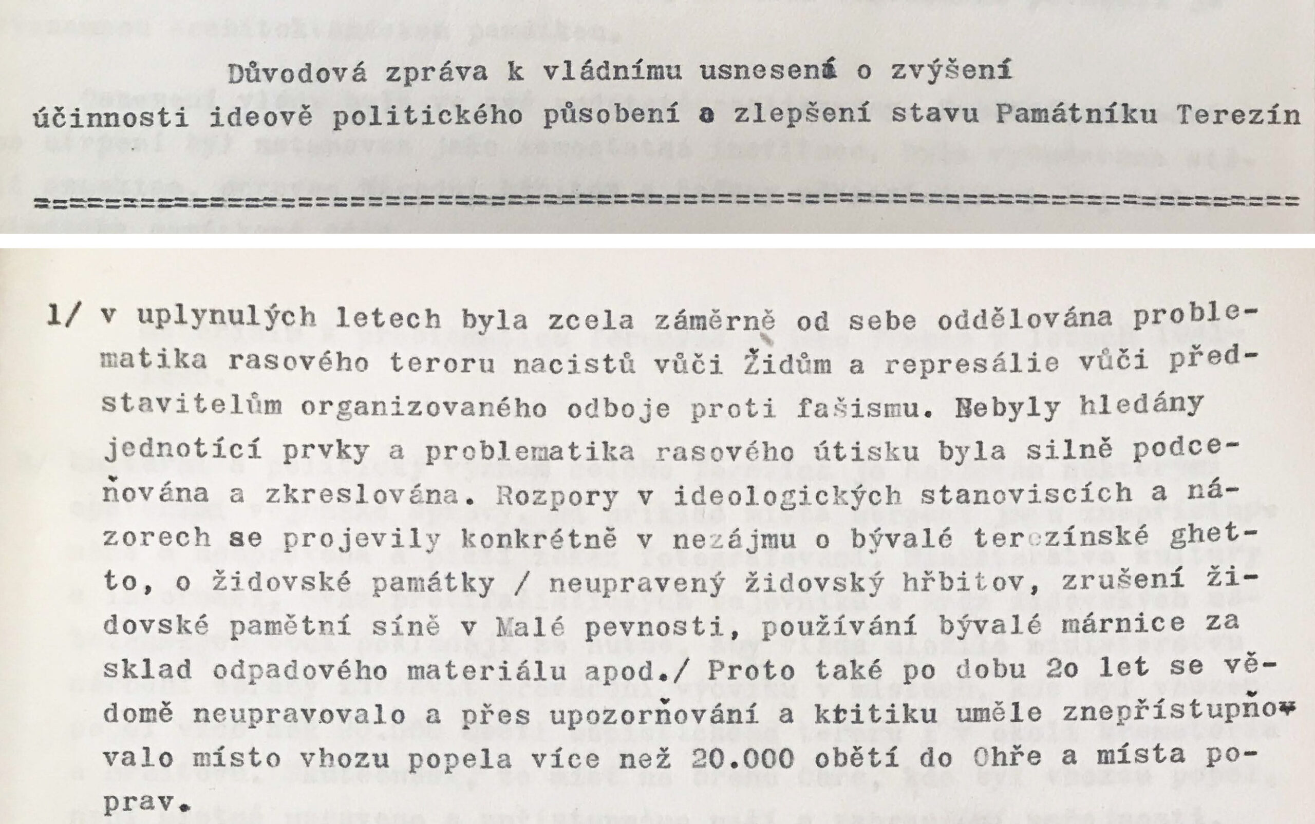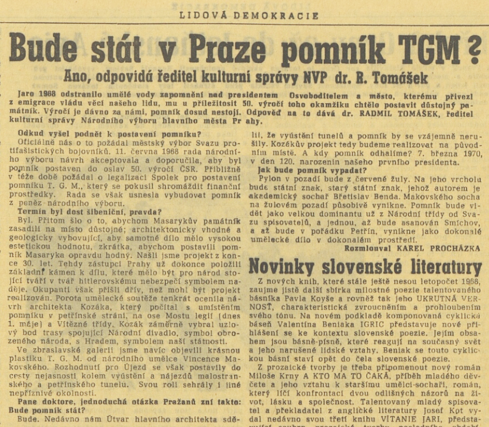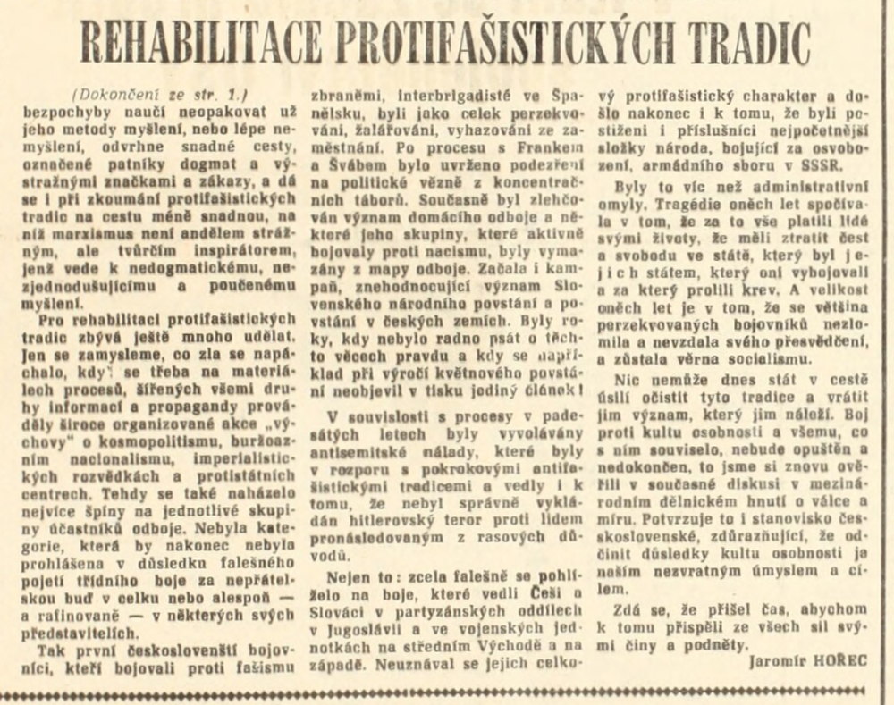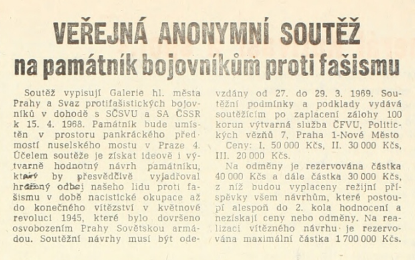 Populární scéna z filmu Pelíšky inscenující odhalení (návrhu) pomníku letcům RAF má reálný základ – v osmašedesátém se opravdu o vybudování pomníku západním letcům mluvilo, i když na letenské pláni na architektuře Stalinova pomníku si lidé představovali spíš konečně důstojný pomník pražskému povstání. S pražským jarem se naplno otevřelo okno pro nejrůznější, dříve minimálně nepodporované komemorační iniciativy. Vyvěraly ze značného společenského zájmu o zamlčovanou minulost, v první řadě o téma politických represí padesátých let plnící stránky necenzurovaného tisku. S novou intenzitou se o adekvátní připomínání odboje přihlásil Svaz protifašistických bojovníků, nyní i v rovině osobní rehabilitace aktérů, kteří byli po válce politicky perzekvováni a kriminalizováni. S velkým přispěním svazu se komemorace druhé světové války orientovaly na národní odboj a jeho hrdiny. Protifašističtí bojovníci usilovali i o rehabilitaci prvního odboje – podíleli se na obnovování pomníků TGM a vznesli také nárok na do té doby nedotknutelný symbol komunistických bojových tradic, Památník osvobození na Vítkově, který chtěli navrátit původnímu účelu, tedy připomínání legionářské tradice. Angažovali se ve prospěch komemorace nejpočetnější kolektivní oběti války v Československu, československých Židů. Apelovali na zpřístupnění Pinkasovy synagogy s památníkem 77 297 obětí holocaustu z českých zemí, aby si zde veřejnost v březnu 1969 mohla připomenout 25. výročí zplynování terezínského rodinného tábora v Osvětimi-Březince (objekt byl uzavřen kvůli vzlínání spodní vody v roce 1966 a opět zpřístupněn až po pádu komunismu). Iniciovali dílo memorializující pražské Židy zmizelé v holocaustu, ovšem instalace deskového reliéfu sochaře Břetislava Bendy do veřejného prostoru pak byla politicky blokována až do závěru normalizace. Stejně tak kvůli novému vzedmutí politiky antisionismu nezbylo téměř nic z plánů, které připravilo ministerstvo kultury pro připomínání svébytné problematiky útlaku Židů v Terezíně.