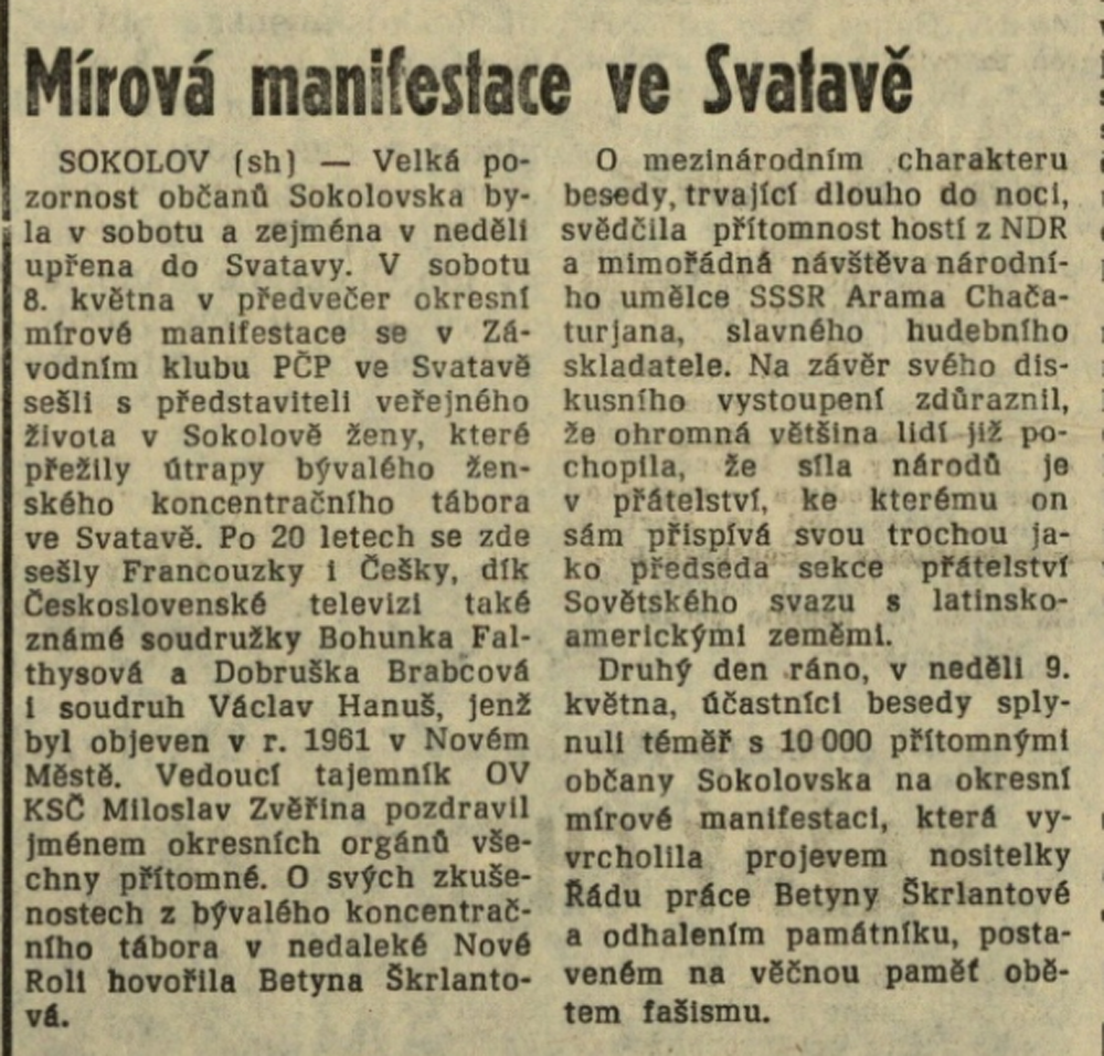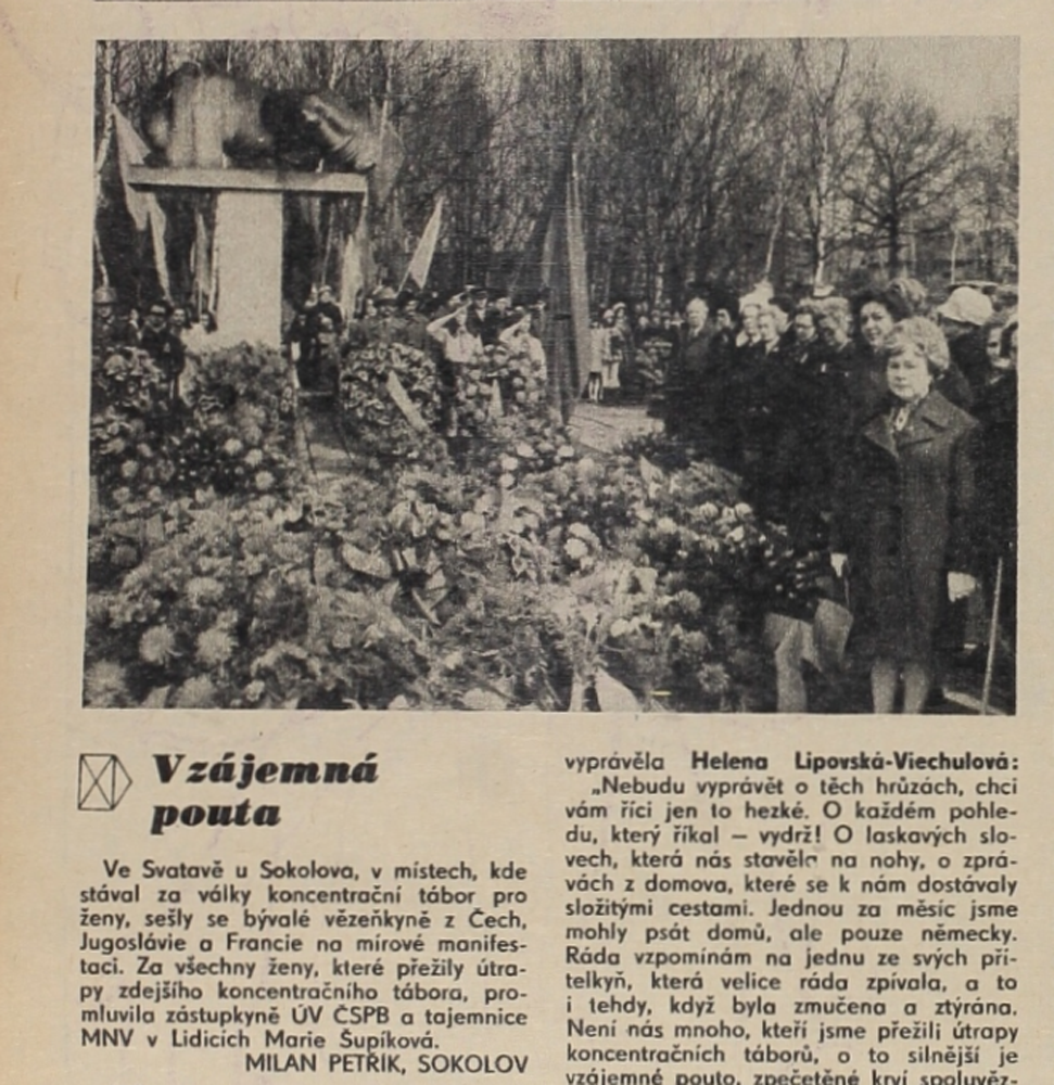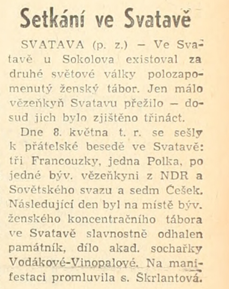 Po převážně militaristické a maskulinní symbolice předchozího období, kdy postava ženy byla využívána především jako doplněk sloužící k umocnění představy o bezpodmínečném přijetí (vítání) rudoarmějců, se sochaři v mnohem větší míře vraceli k různým variantám ženské symboliky. Opět se začaly objevovat pomníky ženským obětem války či konkrétním hrdinkám protifašistického odboje. Svoji roli bezesporu sehrál i vzrůstající podíl žen-sochařek na veřejných zakázkách. Na počátku šedesátých let uspěla ve veřejných soutěžích sochařka Daniela Vinopalová na dva pomníky věnované ženám z koncentračního tábora ve Svatavě (Zwodau), které nepřežily věznění a nucené práce, resp. zemřely při pochodu smrti nedaleko obce Krásno (Schönfeld). Vytvořila díla, jež se vědomě distancovala od tradičního pojetí heroizovaných postav a hlásila se k moderním estetickým formám inspirovaným tvorbou Henryho Moora. Pomník v Krásně odhalila obec v roce 1963 k výročí ruské bolševické revoluce. To samo o sobě devalvovalo jeho poselství. Vedení obce, jemuž civilní pojetí pomníku patrně nekonvenovalo, navíc bez vědomí autorky upravilo jeho vyznění změnou dedikačního nápisu a doplněním pěticípé hvězdy na nosném podstavci. Začlenění do žádoucího ideologického rámce se nevyhnul ani pomník ve Svatavě. Slavnostního odhalení k výročí osvobození v květnu 1965 se sice na pozvání zúčastnily bývalé zajatkyně, mimo jiné z Francie, zároveň pomník sloužil jako místo tradičních, režimem inscenovaných manifestací (žen) za mír.