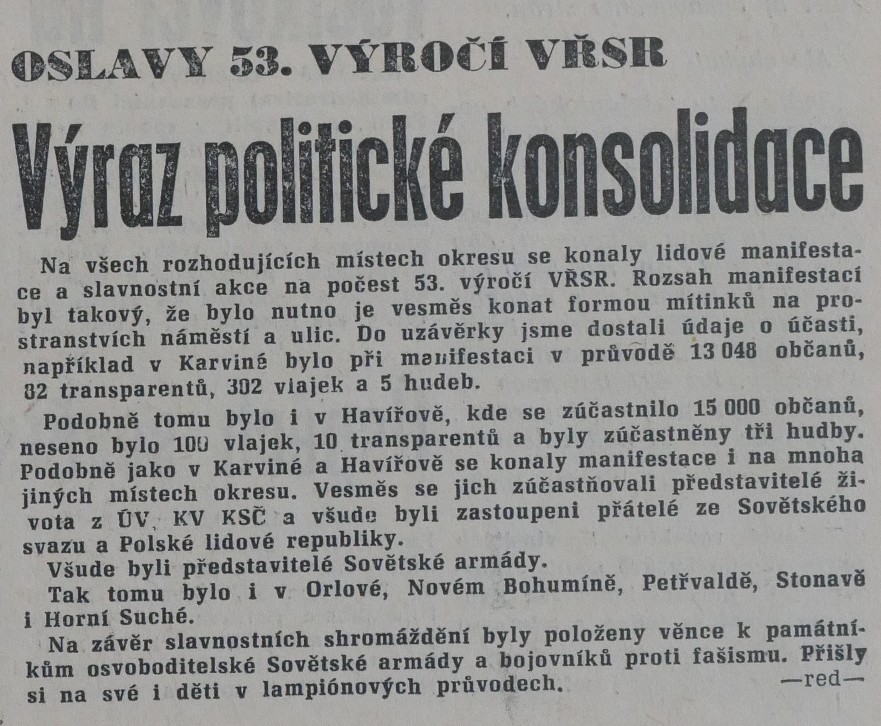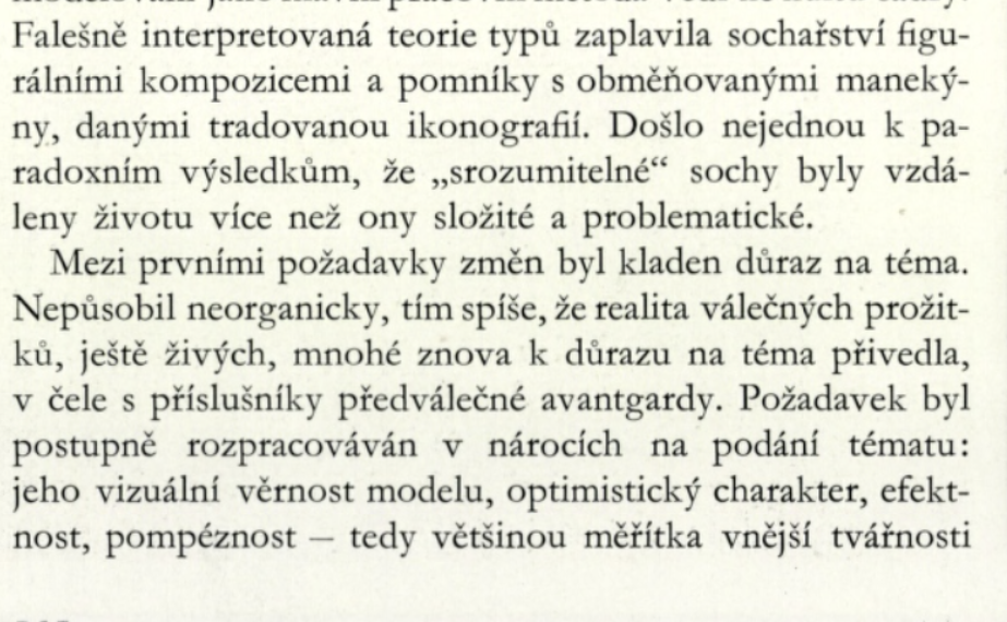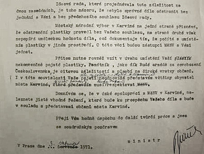 Kritická slova o „pomnících s obměňovanými manekýny“, která ve svém bilančním článku o poválečném sochařství z roku 1965 použil teoretik a historik výtvarného umění Jiří Šetlík, bylo jistě možné vztáhnout i na dosavadní značně stereotypizované plastiky rudoarmějců. Umělci a členové pomníkových komisí však místo experimentování s jejich zpodobňováním začali postavy samotných rudoarmějců raději nahrazovat úplně jinými motivy. Jako by úcta k nezpochybnitelnému vzoru jiný než realistický přístup neumožňovala. Na pomnících, které vzešly ze soutěží při příležitosti dvacátého a pětadvacátého výročí osvobození sovětskou armádou, se postavy rudoarmějců vyskytovaly jen sporadicky. A byť i u nich lze pozorovat jistý formální posun, nedocházelo k dramatickému odklonu od realistického kánonu. Zvláštní výjimku na čas tvořil památník osvobození v Karviné.