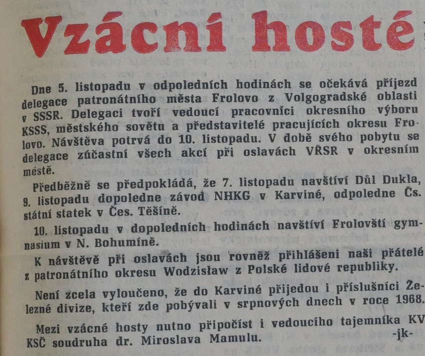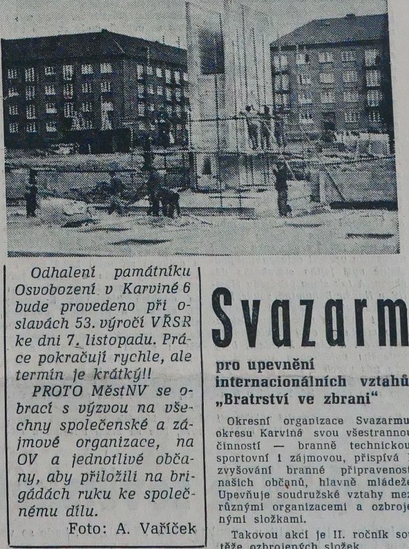 Při příležitosti 20. výročí osvobození vyhlásil okresní národní výbor soutěž na památník osvobození v Karviné. Monument, jehož záměrem bylo vyjádřit úctu a vděčnost československého lidu „heroickému boji a obětem sovětské armády“, se autorská dvojice architekta Blažeje Heisera a sochaře Jaroslava Brože rozhodla osadit avantgardní moorovskou plastikou nazvanou Bojovník. Komise složená z výtvarníků i městských a okresních funkcionářů jejich návrh v roce 1965 jednoznačně zvolila pro „hluboký humánní obsah a pozoruhodnou sochařskou koncepci“. Památník měl být původně odhalen v květnu 1968 při příležitosti oslav osvobození a 700. výročí založení Karviné, ale jeho realizace se nakonec více než o dva roky protáhla. Slavnostní inaugurace připadla na listopad 1970. Ve značně změněné politické situaci, v době vrcholících čistek a změn na postech místních představitelů moci byla vřazena do bohatého programu oslav Velké říjnové socialistické revoluce, jež měly manifestovat konsolidaci vztahů se Sovětským svazem.