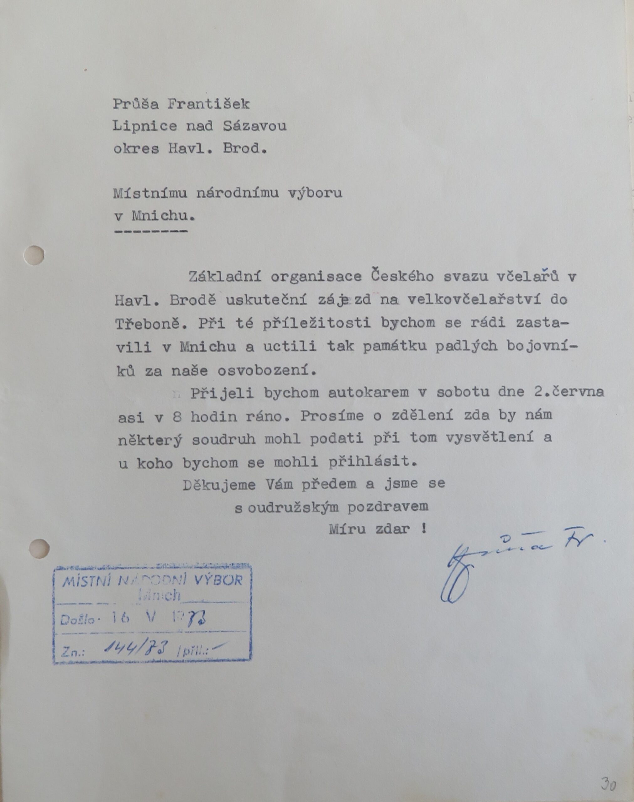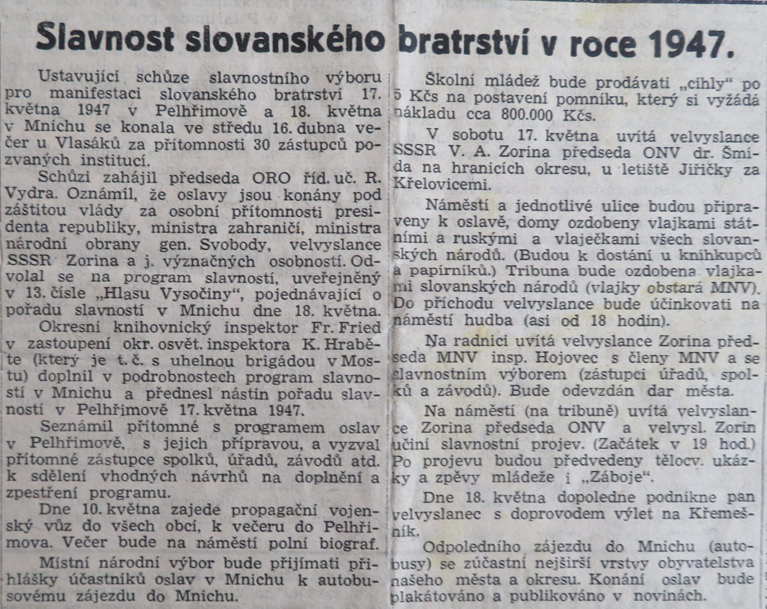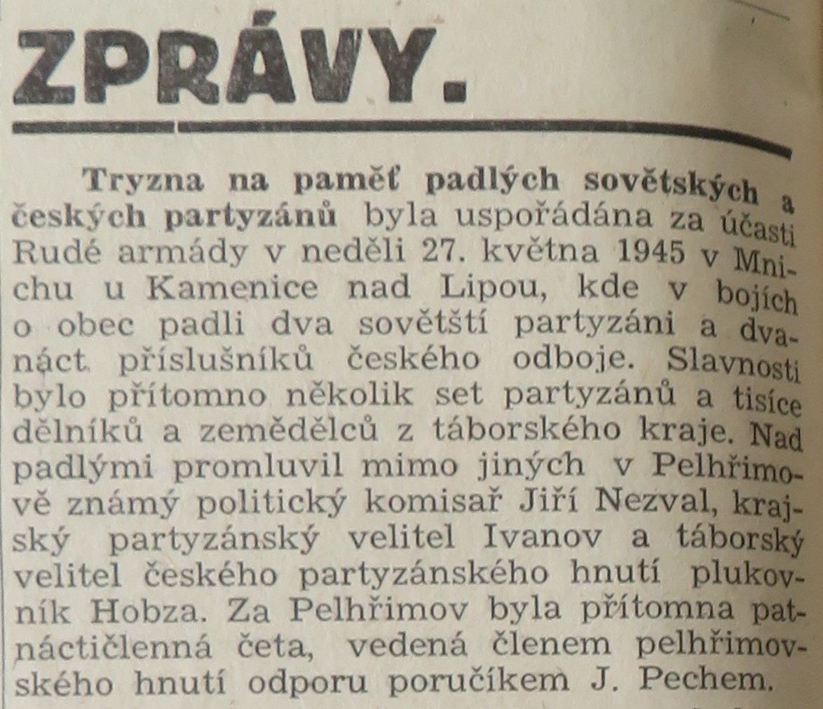 V noci z 5. na 6. května 1945 se odehrála v Mnichu, malé obci nedaleko Kamenice nad Lipou na Českomoravské vrchovině, událost, která vstoupila do historie jako jedno z největších odbojových vystoupení proti nacistické okupaci ve zdejším regionu. Během partyzánské akce, do níž byli zapojeni i zdejší občané, došlo při pokusu o odzbrojení německé posádky k přestřelce. Zahynulo osm místních mužů, dva čeští a dva sovětští partyzáni, další ztráty na životech utrpěla partyzánská skupina a povstalci ještě v následujících dnech. Tento incident z posledních dnů druhé světové války dal vzniknout významnému pamětnímu místu protifašistického odboje na pomezí Vysočiny a jižních Čech, jemuž dominuje památník slovanského bratrství.