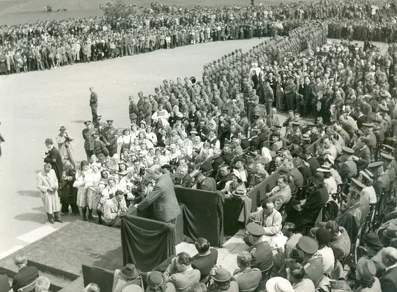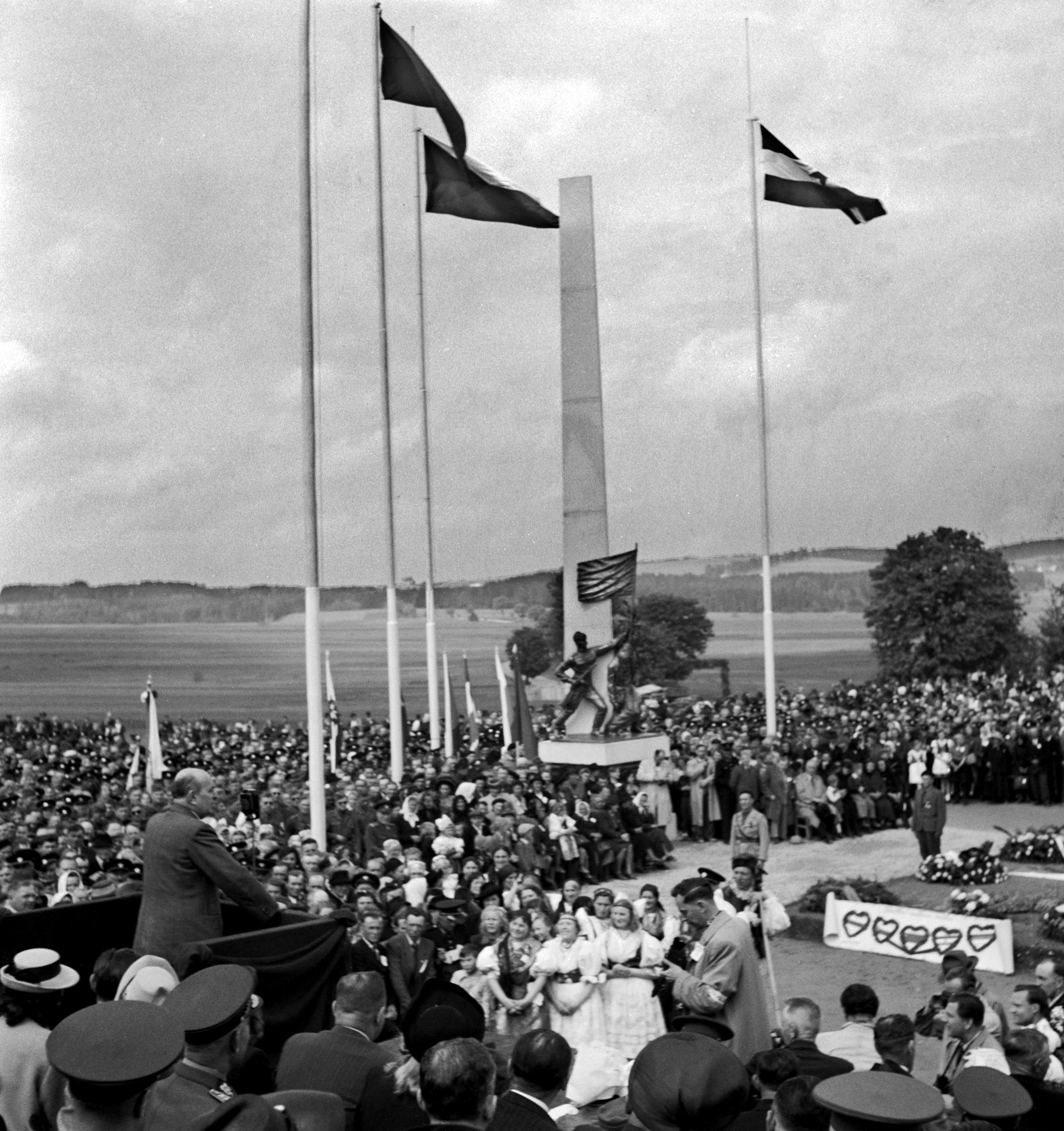 Slavnost odhalení památníku byla spojena s propagací slovanské (bojové) vzájemnosti a zviditelňováním formované tradice partyzánských obcí jako nových míst paměti. V několika jihočeských městech byly den před oslavami v Mnichu zorganizovány manifestace slovanského bratrství, kde jako čestní hosté promluvili reprezentanti zastupitelství slovanských států. V noci pak do Mnichu zamířily „partyzánským pochodem“ soutěžní skupiny skautů, sokolů a dalších organizací, aby byly přítomny samotnému odhalení památníku, které proběhlo 18. května 1947. Zúčastnili se ho zástupci diplomatických sborů Sovětského svazu, Jugoslávie, Polska a Bulharska, československou vládu zastupoval ministr zahraničních věcí Jan Masaryk, kancelář prezidenta gen. Antonín Hasal. Za Sdružení českých partyzánů promluvil předseda Rudolf Slánský, který v projevu zmínil údajnou nelibost partyzánů nad nedostatečnou národní očistou.