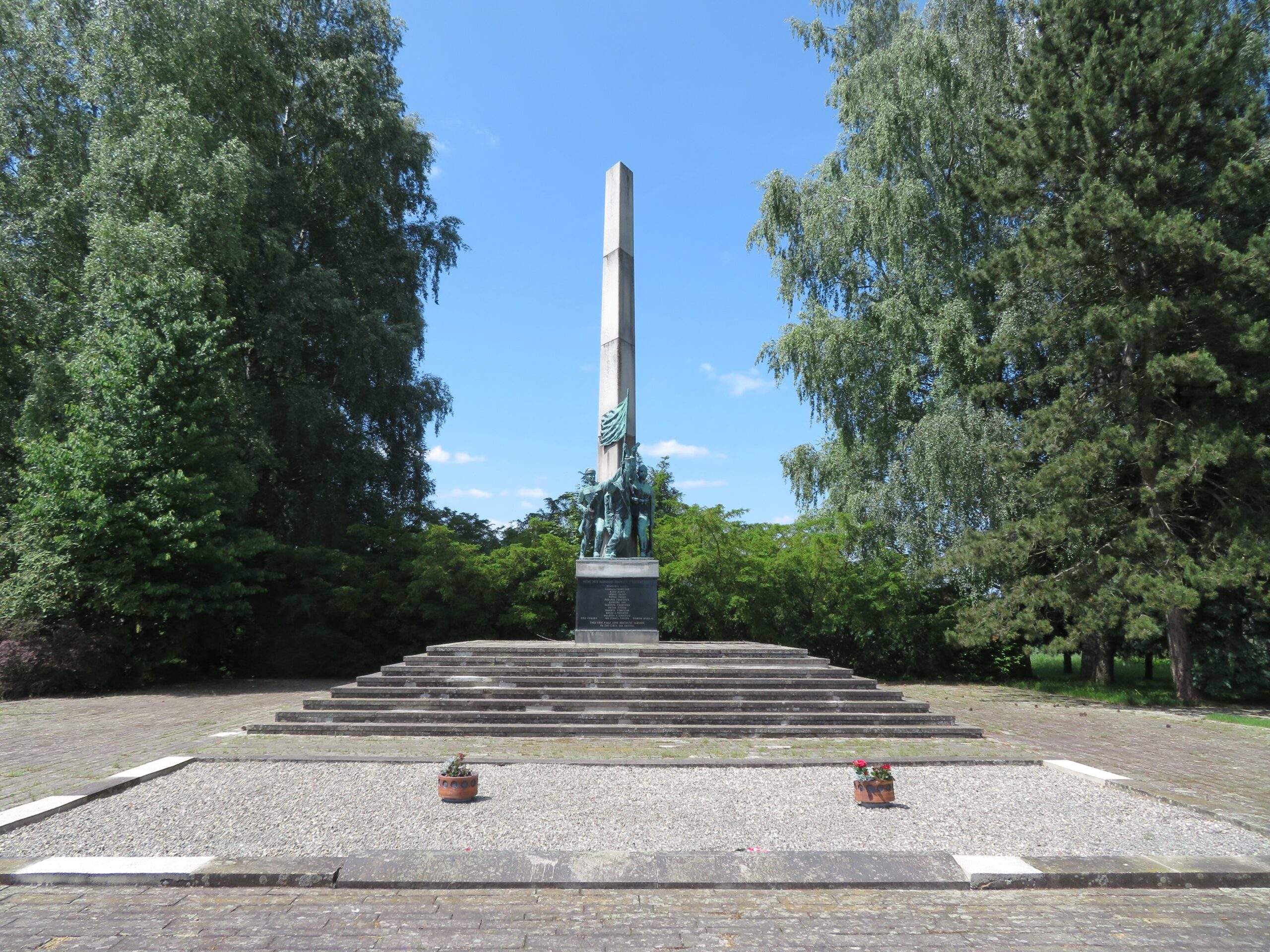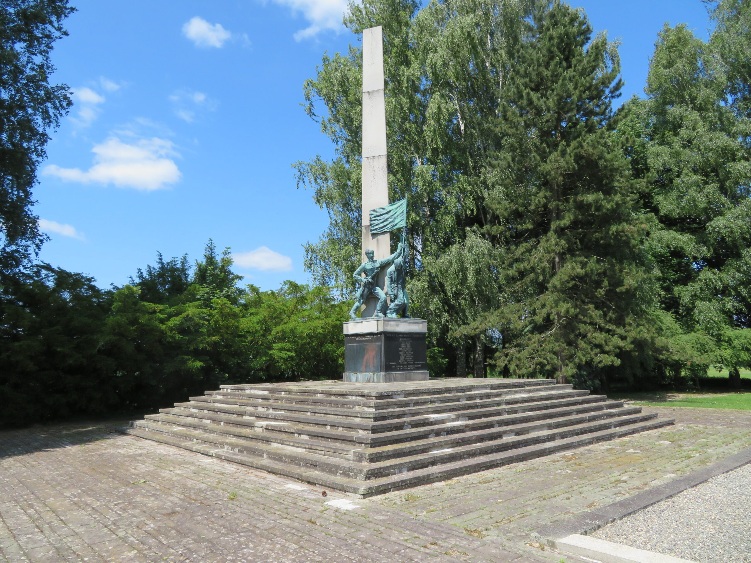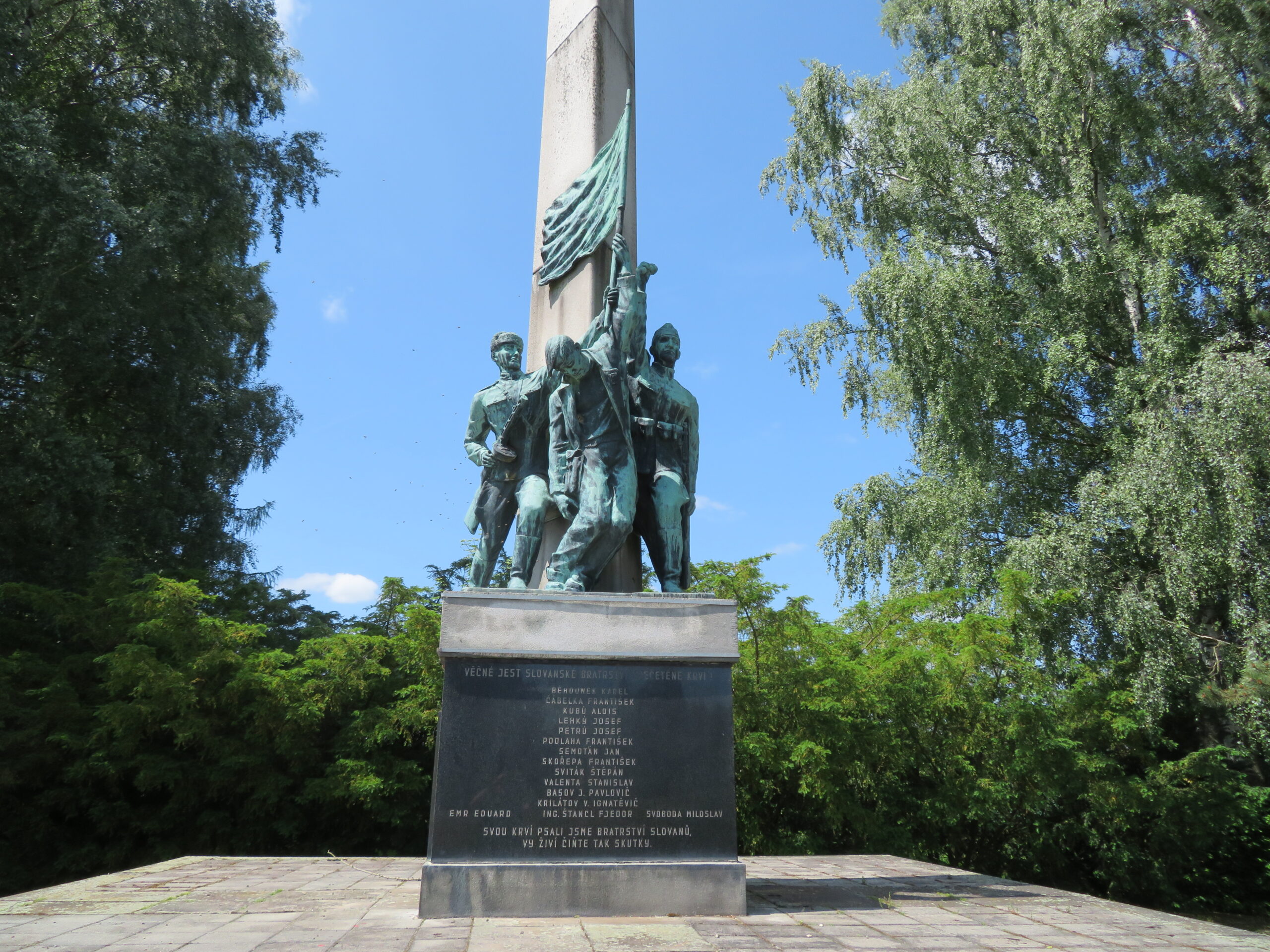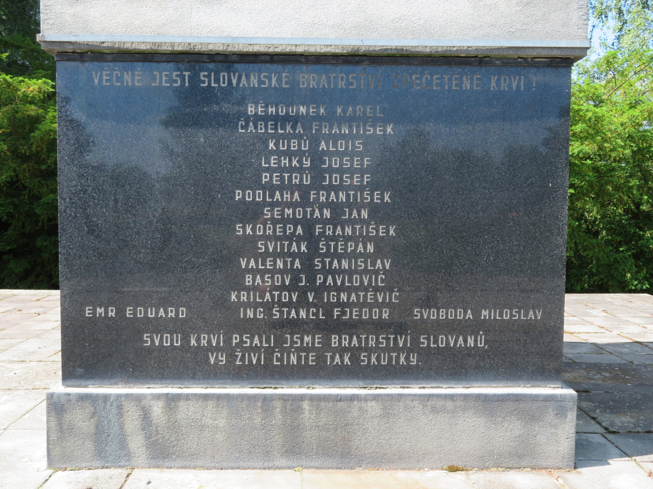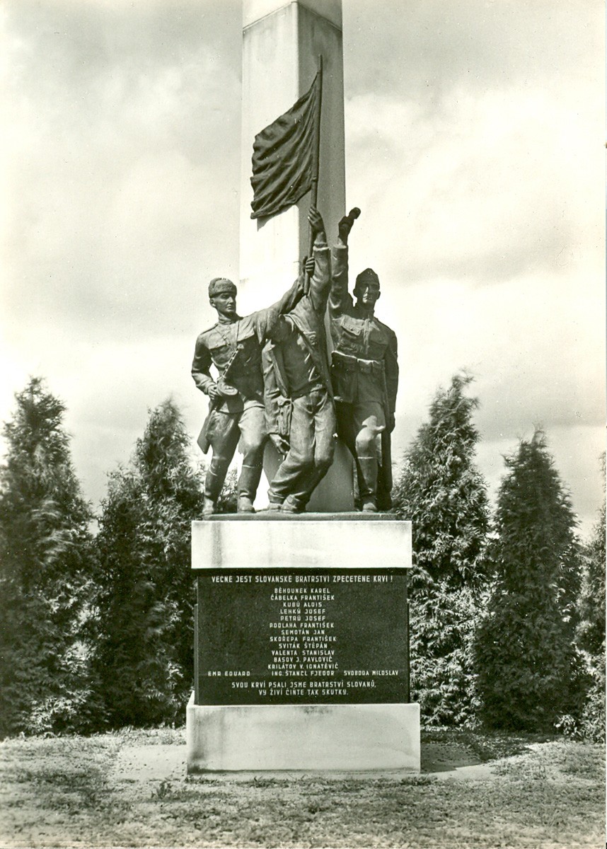 Monumentálně pojatý pomník v podobě dvanácti metrů vysokého žulového obelisku s bronzovým sousoším tří bojovníků měl, jak psal dobový tisk, „ukazovat daleko za kopce Českomoravské vysočiny veliké a krásné sbratření bojovníků Sovětského svazu a českých partyzánů za svobodu“. Postavy symbolizují příslušníky tří národů ve společném boji: uprostřed je Čechoslovák, ztvárněný raněným mužem v civilním oblečení, který se hroutí po nepřátelském zásahu a z posledních sil drží prapor. Tato symbolika má ukazovat utrpení českého národa, ale i jeho odvahu v osvobozovacím boji a oběti domácího odboje. K odbojáři z jedné strany přispěchává voják Rudé armády se samopalem, aby prapor zachytil, z opačné strany vystupuje Jugoslávec připravený házet granát. Na podstavci obelisku jsou umístěny žulové desky s nápisy „Věčné jest slovanské bratrství zpečetěné krví“ v češtině, ruštině a srbochorvatštině a bronzové desky se jmény více než 1800 obětí nacismu z velké části jižních Čech a západní Vysočiny. Čelní deska nese jména padlých v Mnichu a okolí, uložených do společného hrobu.