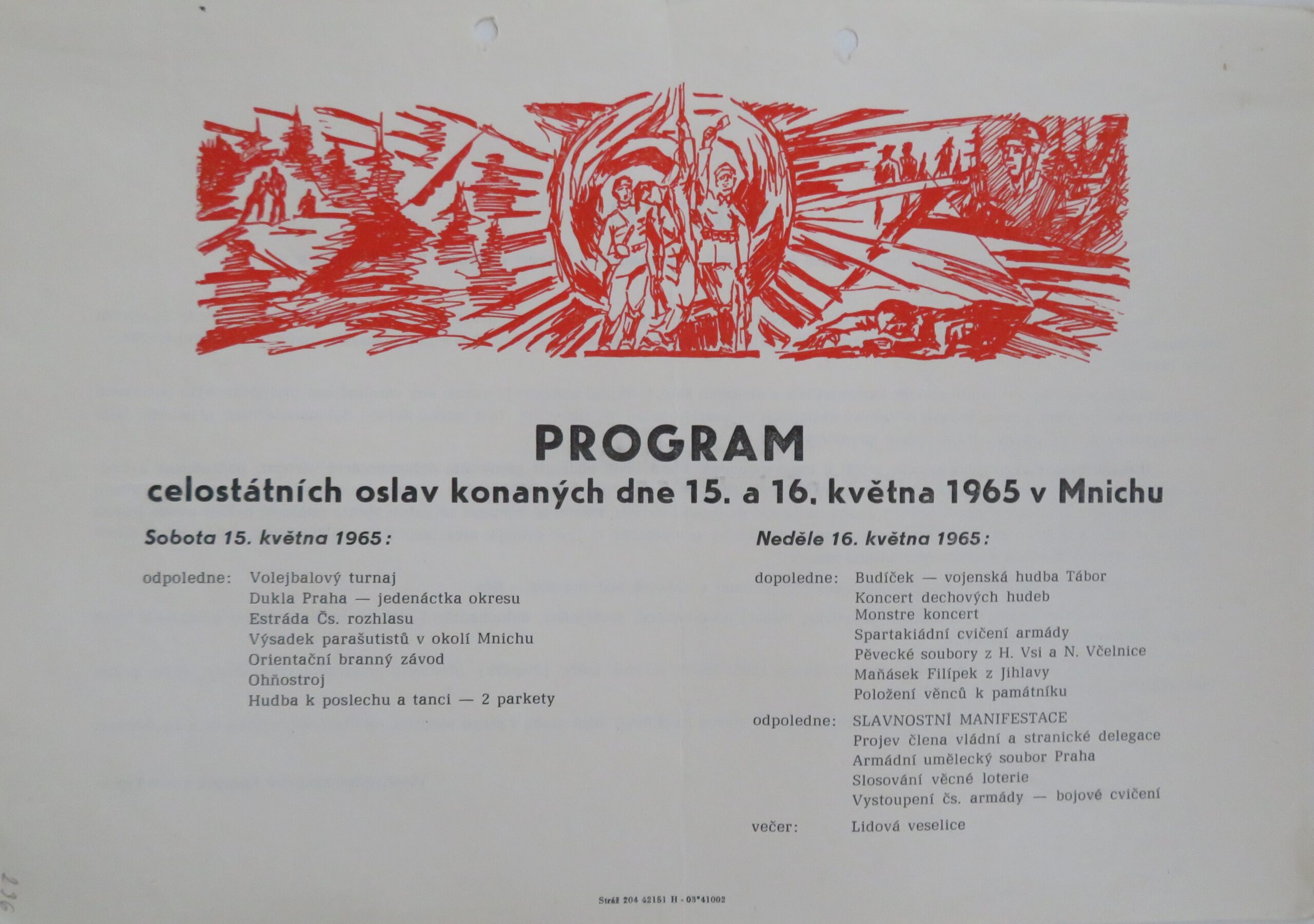Květnové oslavy v Mnichu byly velkým organizačním podnikem, které si vyžadovaly rozsáhlé přípravy a intenzivní plánování a zapojení různých složek okresních a místních samospráv, orgánů KSČ, Národní fronty a Českého svazu protifašistických bojovníků. Při pořádání výročních (jubilejních) oslav byl ještě ustavován výbor pro přípravu oslav, který se skládal z různých pomocných komisí: organizační, propagační, finanční, kulturně-sportovní, technické, zásobovací, dopravní, ubytovací, zdravotní nebo bezpečnostní služby, což dokládá, jakou důležitost se přikládalo těmto oslavám a jejich zajištění. V průběhu doby se měnil také program oslav, mimo výroční roky jednodenní, při jubilejních dvoudenní. Některé rituální akty ale v zásadě nikdy nechyběly: manifestační pochod pracujících k pomníku, pokládání věnců, projevy funkcionářů a pamětníků-partyzánů, vojenská přehlídka s přísahou nováčků z posádky v Jindřichově Hradci a slib pionýrů. Širší veřejnost měl k účasti získat hlavně různorodý společensko-kulturní a sportovně-branný doprovodný program. Během oslav se v Mnichu konaly různá branně bezpečnostní vystoupení Svazarmu nebo ozbrojených složek (seskok parašutistů, přehlídka výtvorů modelářů, představení výcviku služebních psů, ukázky bojového výcviku armády), sportovní akce (fotbalový zápas, branný závod, ukázky spartakiádního vystoupení), kulturní pořady (vystoupení československých a sovětských armádních uměleckých souborů, koncerty dechových hudeb i populárních zpěváků, přehlídka zájmových kroužků lidové tvořivosti, taneční zábava, program pro děti aj.) a v neposlední řadě také akce formující správné ideové postoje (besedy s partyzány, setkání s delegacemi družebních měst a obcí, setkání mládeže, výstavy v kulturním domě).