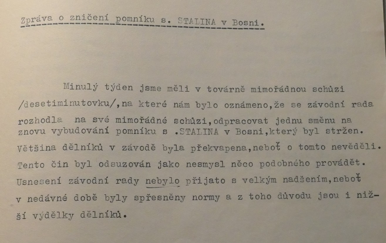 Navzdory masové mobilizaci, kterou bylo obyvatelstvo do budování Stalinových pomníků přímo či nepřímo zapojováno, vyvolávaly tyto objekty všelijak ventilované kontroverze. Je to zřejmé i z poměrně běžných ataků, jimž Stalinovy pomníky už během padesátých let čelily. Došlo k nim například ve Cvikově, Rýmařově či Bosni. V posledním případě se jednalo o menší ovocnářskou obec poblíž Mnichova Hradiště, která byla specifická hned v několika ohledech. Umístění Stalinovy sochy sem zprostředkoval agilní asistent Akademie výtvarných umění, který odsud pocházel a zřejmě stál i za oficiálními družebními vazbami mezi pražskými umělci a místním jednotným zemědělským družstvem. Se sochařem Karlem Pokorným dohodl darování oceněného, ale nevyužitého soutěžního modelu pro pražský Stalinův pomník, s JZD, KSČ a národním výborem v Bosni zase převoz a instalaci sochy. Vzhledem k tomu, že šlo o sádrový model, o sochu dále restaurátorsky pečoval. Této víceméně soukromé iniciativy se chopily vyšší stranické orgány, které ze slavnostního odhalení udělaly celookresní akci spojenou s propagací družstevnictví. Místní obyvatelé tedy byli do budování pomníku zaangažováni jen okrajově.