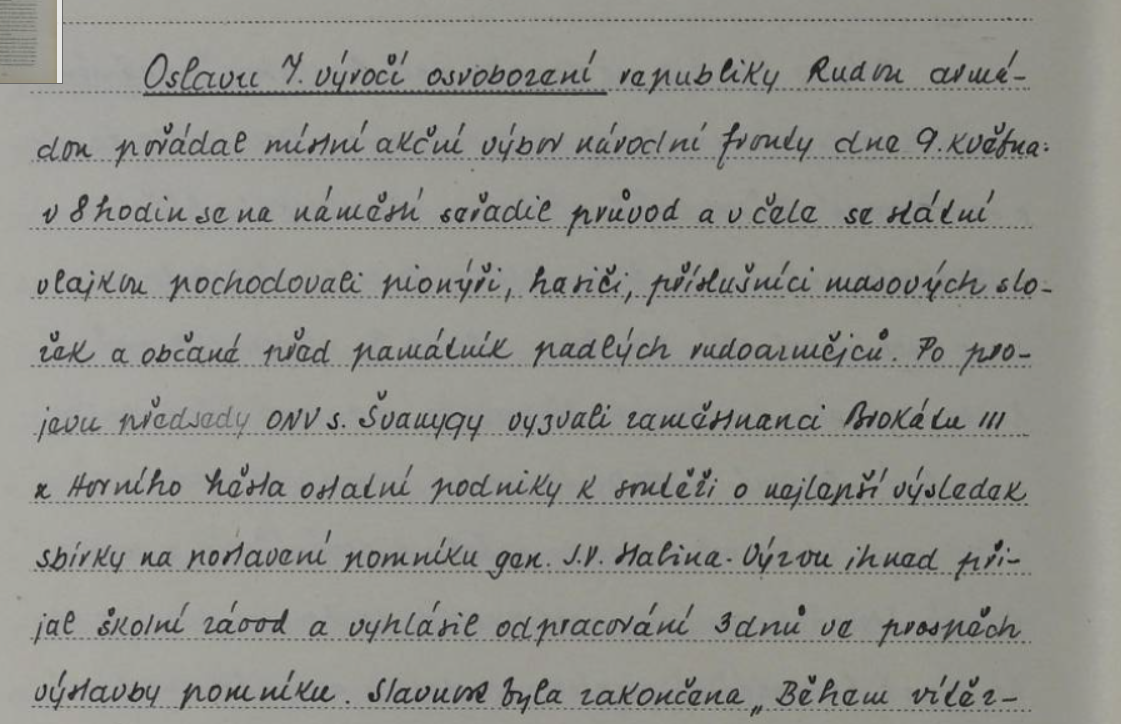 V soutěži na plastiku místo pomníku Stalina zvítězil Jiří Jílek v konkurenci sochařů, mezi nimiž byli i dva autoři Stalinových pomníků v Olomouci a Zábřehu, Vojtěch Hořínek a Rudolf Doležal, nabízejících ponejvíce tradiční ztvárnění rudoarmějců a vděčných zástupců československého lidu. Komise na Jílkově návrhu, autorem nazvaném Májový pozdrav, ocenila, že „vyznívá optimisticky a radostně a vyjadřuje přesvědčivou formou ideu osvobození naší republiky s perspektivou budovatelských úkolů“. Proč se nakonec z Májového pozdravu nestal pomník osvobození nahrazující pomník Stalinův, není zcela jasné. Z později publikovaných Jílkových dopisů vyplývá, že městští funkcionáři rozhodli o ponechání Stalinovy sochy na svém místě a postavení jeho sochy na náměstí Pionýrů už v roce 1965, tedy bezprostředně po soutěži. Z jednoduchého příběhu tak udělali příběh složitý, který se větví a prolíná s dalšími objekty. Skutečnost, že Jílkova socha byla odhalena v roce 1968 při příležitosti oslav 50. výročí vzniku Československa, zcela zamlžila její původní účel připomínat osvobození. Z hlediska oficiálních komemoračních ceremonií se stala marginální a zůstala „pouze“ dekorační plastikou. Její instalace na náměstí spjatém s prvorepublikovou pamětí T. G. Masaryka možná zbrzdila plány na obnovu busty prvního československého prezidenta, na které v letech 1968–1969 rovněž pracoval Jiří Jílek. Ta byla nakonec instalována až v roce 1990.