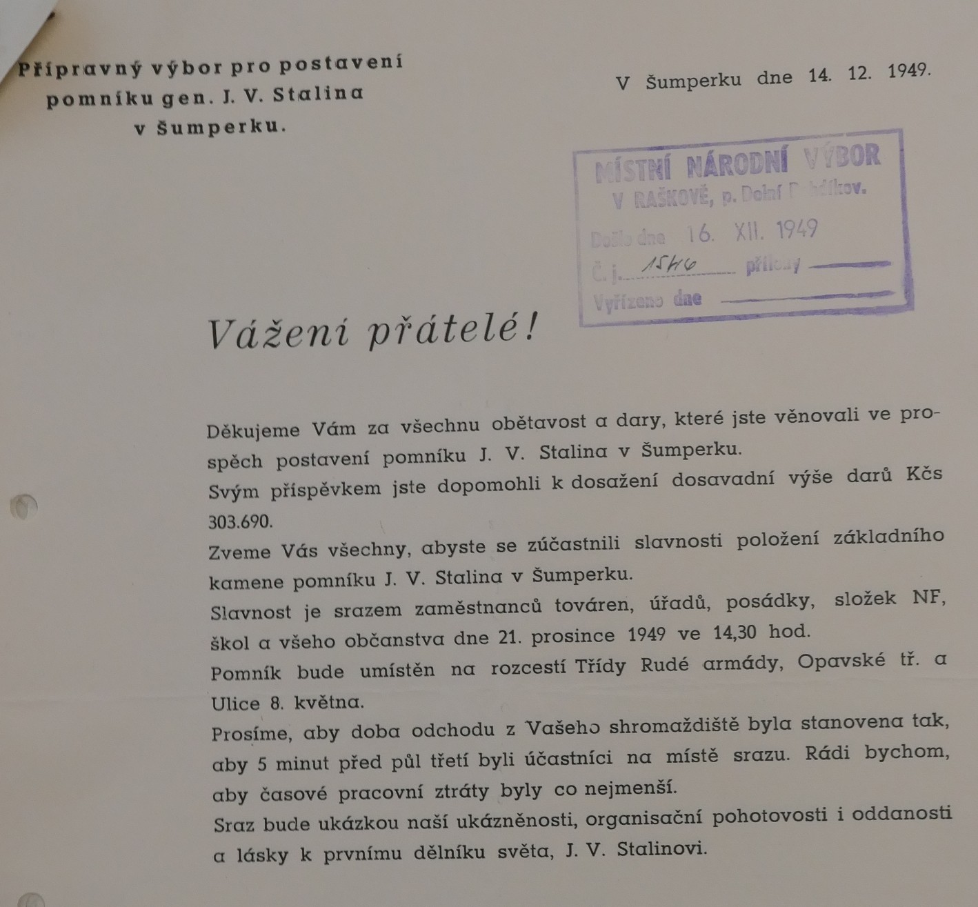 Stalinův pomník v Rýmařově patřil k relativně pozdnějším dílům. Stejně jako pražský pomník byl odhalen při příležitosti 10. výročí osvobození Československa v květnu 1955. Útok, při němž figura sovětského vůdce přišla o hlavu, byl rovněž načasován na významný den oficiálního kalendáře. Tentokrát šlo o 40. výročí bolševické revoluce. Z činu byl ještě týž den, tedy 7. listopadu 1957, usvědčen patnáctiletý student místní jedenáctiletky Karel Raška. Dekapitaci Stalinovy sochy, kterou on sám během výslechu zdůvodnil snahou způsobit ve městě rozruch, vyšetřovací orgány kvalifikovaly jako trestný čin hanobení spojeneckého státu a poškozování majetku v socialistickém vlastnictví. Krajský prokurátor nechal Rašku okamžitě zavřít do vazební věznice v Olomouci, údajně kvůli podezření, že by se při stíhání na svobodě mohl pokusit o útěk. Před soudním procesem Rašku shodou výjimečných okolností zachránila amnestie Antonína Novotného, který ke konci listopadu 1957 vystřídal na postu prezidenta republiky právě zemřelého Antonína Zápotockého. Ještě v prosinci byl Raška z vězení propuštěn. Vyšetřování sice bylo zastaveno, ale to nezabránilo jeho vyloučení ze střední školy. Socha Stalina byla opravena a bez zvláštní publicity vrácena na své místo.