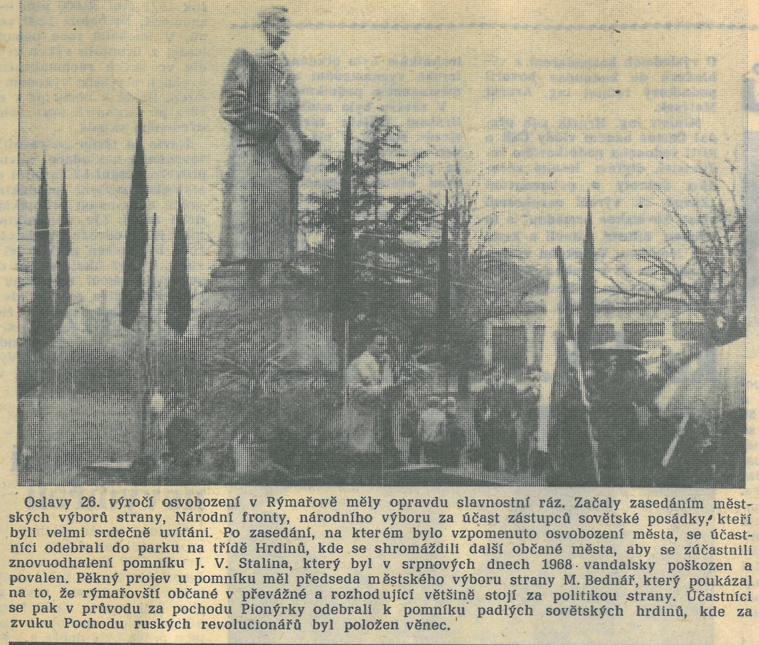 Socha Stalina vydržela na svém místě do roku 1968 a dlouho se zdálo, že ustojí liberalizaci i anonymní stížnosti na její existenci. Straničtí funkcionáři ve městě ji hájili s tím, že sochy by se bourat neměly. Až opakované ataky na pomník je přiměly změnit názor a socha byla v létě 1968 odklizena do muzea. Právě toto načasování bylo klíčové pro její obnovu v roce 1970. Částečná rehabilitace Stalina v brežněvovském Sovětském svazu, výrazně medializovaná okolo jeho nedožitých devadesátých narozenin na konci roku 1969, se střetla s normalizační potřebou důkladně se vypořádat s projevy a pozůstatky roku 1968. Odstranění Stalinovy sochy tak mohlo být zařazeno mezi odsouzeníhodné činy pravicového oportunismu, které vyžadují nápravu. Reinstalovaná socha Stalina sloužila Šumperským k oficiálním rituálům až do doby, kdy byla v druhé polovině osmdesátých let odsunuta do parčíku pod zámek, aby uvolnila místo pro výstavbu monumentálního pomníku Osvobození. Projekt v podobě rudoarmějce s dívkou a reliéfem byl v důsledku listopadových událostí roku 1989 zastaven v průběhu dokončovacích prací a těsně před původně plánovaným odhalením v květnu 1990. Socha Stalina, která dlouho měla vyjadřovat vděk za osvobození, lásku k SSSR a poté nenávist k pražskému jaru, byla odstraněna až, respektive už na konci listopadu 1989.